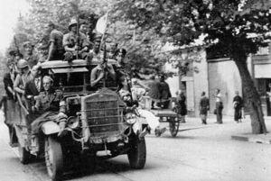 As early as September 1938, the Italian military had drawn up plans to invade Albania. On 7 April, Italian forces landed in the country and within three days had occupied the majority of the country. Albania represented a territory Italy could acquire for "'living space' to ease its overpopulation" as well as the foothold needed to launch other expansionist conflicts in the Balkans.[23] On 22 May 1939, Italy and Germany signed the Pact of Steel joining both countries in a military alliance. The pact was the culmination of German-Italian relations from 1936 and was not defensive in nature.[24] Rather, the pact was designed for a "joint war against France and Britain", although the Italian hierarchy held the understanding that such a war would not take place for several years.[25] However, despite the Italian impression, the pact made no reference to such a period of peace and the Germans proceeded with their plans to invade Poland.[26]