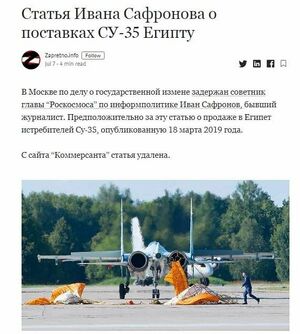 في 18 مارس 2019، نشر سافرونوڤ مقالًا في صحيفة الكومرسانت حول خطط لتزويد مصر بمقاتلات روسية من طراز سو-35. أنكرت شركة روسوبورونإكسپورت كل شيء، وفي يونيو فُتحت قضية ضد كومرسانت. نتيجة لذلك، اختفى المقال من موقع المنشور على الإنترنت، واستقال سافرونوڤ نفسه من قسم التحرير في مايو، إلى جانب قسم السياسة بأكمله. كان السبب في ذلك هي المادة اتي نشرها حول الاستقالة المحتملة لماتڤينكو.