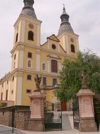 • Felnémet – This village, north of the town, was annexed to Eger in 1961 but still has a rural character. The parish church (1715–1750s, designed by Gianni Battista Carlone, an Italian who settled in Eger) was started by Bishop Gábor Antal Erdődy as a votive church after an outbreak of bubonic plague in 1710, and completed by his successor. It was dedicated to St. Rosalia, a guardian against plague.