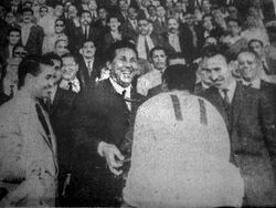 At the level of celebrities many popular singers chaâbi encourage USMAlger, most notably El Hadj M'Hamed El Anka The Grand Master of Andalusian classical music and Algerian chaâbi music was one of the biggest fans of the club, also helping the club through his revenues from concerts.[34] Singers chaâbi, El Hachemi Guerouabi, was a famous supporter of the USM Alger and used to come many times to the stadium to watch his favorite team. also dedicated one of his songs to USMA.[34] There are many popular chaâbi singers who support the club, such as Abdelkader Chaou and Mourad Djaafri who presented many songs for USMA. At the level of politicians, the most prominent fan was the first President of Algeria, Ahmed Ben Bella, who was a former player during the French colonialism. Where was a player in Olympique de Marseille, Ben Bella attended the first championship final in Algeria and the winner was USM Alger where handed him the championship cup, after the coup against him and placed him under house arrest by Houari Boumediene. Ben Bella was always asking about USM Alger, Ben Bella was the honorary president of the club until his death in 2012.[35]