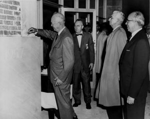 Macmillan flew to Washington, DC, for talks on 25 October.[57] He had concerns that the disastrous 10 October Windscale fire might prove a stumbling block in negotiations,[58] as it might reflect badly on British expertise and provide ammunition for opponents of closer co-operation with the British. He ordered extra copies of the report into the fire to be destroyed and for the printers to destroy their type.[59] He immediately sensed how shaken the Americans had been by Sputnik,[54] which placed the Eisenhower administration under great public pressure to act on the deployment of IRBMs by a shocked and distraught nation.[60]