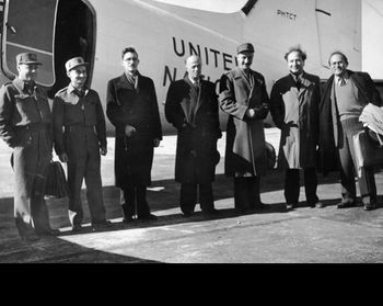الفريق الإسرائيلي المفاوض. من اليمين إلى يسار: رئوڤن شيلواح، والتر إيتان، إيگال يادين، إلياهو ساسون (مدير دائرة شئون الشرق الأوسط)، شبطاي روزن (المستشار القانوني لوزارة الخارجية). يقفون لالتقاط صورة أمام الطائرة التي ستقلهم إلى رودس لمباحثات الهدنة في 1949.