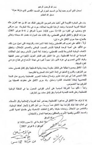 اتفاق حماس فتح في مكة هو اتفاق بين حركتي فتح و حماس وقع في مدينة مكة في 8 فبراير 2007 م بعد مداولات لمدة يومان و تم الأتفاق على أقاف أعمال الأقتتال الداخلي وتشكيل حكومة وحدة وطنية. تم الاتفاق برعاية العاهل السعودي الملك عبد الله. وقد شارك في المداولات التي سبقت الاتفاق العديد من الشخصيات الفلسطينية من الطرفين (فتح وحماس)، كان من بينهم الرئيس الفلسطيني محمود عباس (فتح) والنائب محمد دحلان (فتح) ورئيس الوزراء إسماعيل هنية (حماس) و خالد مشعل (رئيس المكتب السياسي لحركة حماس). ورغم أجواء التفائل الكبيرة التي رافقت التوقيع على الاتفاق إلى أن التوتر بقي موجوداً في الأسابيع التي أعقبت التوقيع. على أي حال انهار الاتفاق مع أحداث منتصف حزيران في قطاع غزة في يونيو 2007 والتي انتهت إلى أن تؤول السلطة في القطاع إلى حركة حماس.