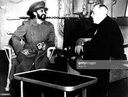 اللقاء الأول بين الملك عبد العزيز والرئيس الأمريكي فرانكلن روزڤلت، 14 فبراير 1945، على متن السفينة كوينسي. |