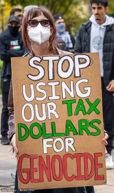 Palestinian-American US congresswoman Rashida Tlaib pleaded for a cease-fire at a rally on 18 October, saying: "We are literally still watching people commit genocide and killing a vast majority just like this, and we still stand by and say nothing."[99] Her remarks at the rally led the Republican caucus within congress to draw up a resolution, sponsored by Marjorie Taylor Greene, to censure Tlaib.[99] On 4 November, Tlaib released a video in which she directly accused President Biden of supporting "the genocide of the Palestinian people".[100][44]