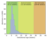مخطط توزيع لعمليات الإجهاض حسب عمر الحمل في إنگلترة وويلز عام 2019 (يسار). الإجهاض في الولايات المتحدة حسب عمر الحمل، 2016 (يمين).