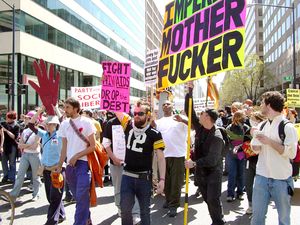 مسيرة إحتجاجية في الشارع ضد سياسات [البنك الدولي] وصندوق النقد الدولي في 16 ابريل، 2005.