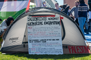 احتج الطلبة في معهد مساتشوستس للتكنولوجيا مطالبين الجامعة بقطع العلاقات البحثية مع الجيش الإسرائيلي.[95] ومنذ صباح يوم الأحد 21 أبريل 2024، أقام المحتجون خياماً للاعتصام أمام قاعة كرسگي. ووضعوا قائمة بأربع مبادئ يطالبون بتنفيذها.[96]