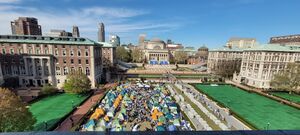 احتجاجات حرم جامعة كلومبيا المؤيدة للفلسطينيين، هي مجموعة احتجاجات احتلال شارك فيها طلاب مؤيدين للفلسطينيين في جامعة كلومبيا بمدينة نيويورك. بدأت الاحتجاجات في 17 أبريل 2024، عندما أقام الطلاب المؤيدون للفلسطينيين مخيمًا يضم حوالي 50 خيمة، وأطلقوا عليه اسم مخيم التضامن مع غزة[22][23] في حرم الجامعة، مطالبين الجامعة بوقف دعمها لإسرائيل. أعطت رئيسة الجامعة نعمت شفيق إذناً لشرطة مدينة نيويورك باقتحام الحرم الجامعي حيث قامت بتفكيك المخيم بالقوة وأجرت اعتقالات جماعية.[23][24] تعتبر هذه هي المرة الأولى التي تسمح فيها الجامعة للشرطة بقمع الاحتجاجات في الحرم الجامعي واعتقال الطلبة، منذ مظاهرات عام 1968 ضد حرب ڤيتنام.[25]