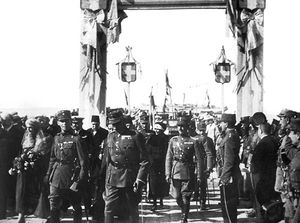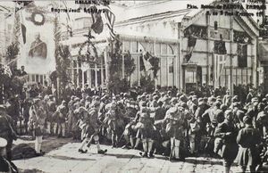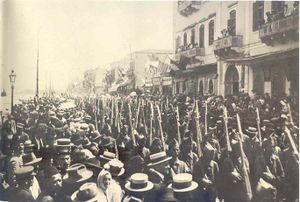 Greek occupation of Smyrna started on 15 May 1919 where a large crowd gathered waving the Greek kingdom flags on the docks where the Greek troops were expected to arrive. The Metropolitan of Smyrna, Chrysostomos, blessed the first troops as they arrived.[4] An inexperienced colonel was in charge of the operation and neither the appointed high commissioner nor high-ranking military individuals were there for the landing, resulting in miscommunication and a breakdown of discipline.[4] Most significantly, this resulted in the 1/38 Evzone Regiment landing north of where they were to take up their post. They had to march south, passing a large part of the Greek celebratory crowds, the Ottoman governor's konak and the barracks of Ottoman troops. Someone fired a shot (Smith indicates that no one knows who) and chaos resulted, with the Greek troops firing multiple shots into the konak and the barracks.[4] The Ottoman troops surrendered and the Greek regiment began marching them up the coast to a ship to serve as a temporary prison. A British subject at the scene claimed he witnessed the shooting deaths of thirty unarmed prisoners during this march, by both Greeks in the crowd and Greek troops. British officers in the harbor reported seeing Greek troops bayoneting multiple Turkish prisoners during the march and then saw them thrown into the sea.[4] In the chaos, looting of Turkish houses began, and by the end of the day three to four hundred Turks had been killed. One hundred Greeks were also killed, including two soldiers. Violence continued the next day and for the next months as Greek troops took over towns and villages in the region and atrocities were committed by both ethnic groups, notably the معركة آيدين on 27 June 1919.[4]