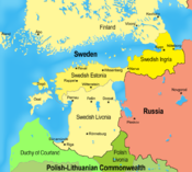 Wars between Sweden and Poland-Lithuania continued until 1629, when the victorious Sweden acquired south Estonia and northern Latvia.[89] Sweden gained Saaremaa from Denmark in 1645.[90] The wars cut the population of Estonia from about 250–270,000 people in the mid-16th century to 115–120,000 in the 1630s.[91]