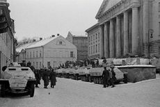 The Red Army reached the Estonian borders again in early 1944, but its advance into Estonia was stopped in heavy fighting near Narva for six months by German forces, including numerous Estonian units.[151] In March, the Soviet Air Force carried out heavy bombing raids against Tallinn and other Estonian towns.[152] In July, the Soviets started a major offensive from the south, forcing the Germans to abandon mainland Estonia in September and the Estonian islands in November.[151] As German forces were retreating from Tallinn, the last pre-war prime minister Jüri Uluots appointed a government headed by Otto Tief in an unsuccessful attempt to restore Estonia's independence.[153] Tens of thousands of people, including most of the Estonian Swedes, fled westwards to avoid the new Soviet occupation.[154]
