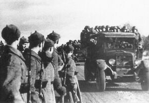 The USSR established a repressive wartime regime in occupied Estonia. Many of the country's high-ranking civil and military officials, intelligentsia and industrialists were arrested. Soviet repressions culminated on 14 June 1941 with mass deportation of around 11,000 people to Russia.[141][142] When Operation Barbarossa (accompanied by Estonian guerrilla soldiers called "Forest Brothers"[143]) began against the Soviet Union on 22 June 1941 in the form of the "Summer War" (الإستونية: [Suvesõda] Error: {{Lang}}: text has italic markup (help)), around 34,000 young Estonian men were forcibly drafted into the Red Army, fewer than 30% of whom survived the war. Soviet destruction battalions initiated a scorched earth policy. Political prisoners who could not be evacuated were executed by the NKVD.[144][145] Many Estonians went into the forest, starting an anti-Soviet guerrilla campaign. In July, German Wehrmacht reached south Estonia. The USSR evacuated Tallinn in late August with massive losses, and capture of the Estonian islands was completed by German forces in October.[146]
