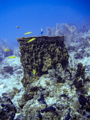 The giant barrel sponge is an important member of the reef community. Sponges filter large amounts of water, and are a predominant link in benthic-pelagic coupling on reefs and they harbor diverse assemblages of bacteria that can take part in nitrification and carbon fixation.[19] It serves as a habitat for various invertebrates which live on the surface or in the interior[6] and is grazed upon by some parrotfish.[20] It is also host to a diverse community of microbes, some of which are primary producers or involved in nitrification.[21]