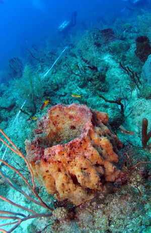 The giant barrel sponge has been called the "redwood of the reef"[4] because of its large size and its long lifespan, which can be more than 2,000 years.[5] It is, perhaps, the best-studied species of sponge in the sea; a population on Conch Reef, in the Florida Keys, has been monitored and studied since 1997.[6]