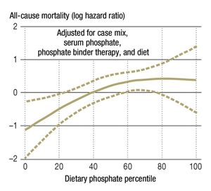More recent studies have shown that the association between high phosphate concentrations and higher mortality is not restricted to persons with renal disease; it can also be observed in persons with cardiovascular disease and even in the general population. High-normal serum phosphate concentrations are associated with coronary calcification in young, healthy men (6) and were found to be a predictor of cardiovascular events in the Framingham study (7). Elevated mortality in association with high-normal serum phosphate concentrations was seen mainly among persons with cardiovascular disease who had normal renal function (8) (Figure 1). In the Framingham study, 375 of the 4127 subjects died within 60 months; the adjusted mortality risk was 22% for each 1 mg/dL elevation of the serum phosphate concentration.