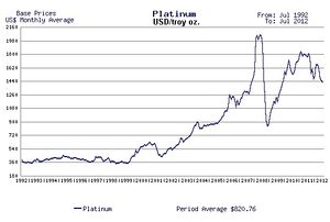 متوسط سعر الپلاتين من عام 1992 حتى 2012 بالدولار الأمريكي لكل أوقية (~20 دولار/گ)[12]