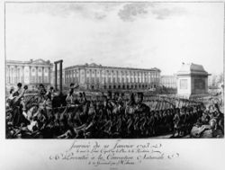 وفي 20 يناير قتل العضو السابق في فيلق حراسة الملك، لوي-ميشل لپلتييه دي سان-فارجو Louis-Michel Lepeletier de Saint-Fargeau الذي كان قد صوت لصالح قتل الملك. وفي 21 يناير حملت عربة يحيط بها حرس مسلح، سارت على طول الشوارع التي حددها الحرس الوطني، لويس السادس عشر إلى ميدان الثورة (الآن ميدان الكونكورد Concorde أي ميدان الوفاق والوئام). وقبل أن تهوي عليه المقصلة حاول أن يتحدث إلى الجموع: "أيها الفرنسيون، إنني أموت بريئا .. إنني أقول ذلك وأنا على سقالة المقصلة وسأمثل قريبا أمام الرب. إنني أعذر أعدائي، وآمل أن فرنسا - " لكن عند هذه الكلمة أشار سانتير Santerre رئيس حرس باريس الوطني وقال: فلتدق الطبول Tambours " فدقت الطبول، وراحت الجماهير تنظر في صمت كئيب والنصل الثقيل يسقط، وراحوا يبكون حتى النخاع، وفي وقت لاحق قال واحد ممن حضروا هذا المشهد" في ذلك اليوم راح كل واحد يسير ببطء ولم يكن الواحد منا يجسر على النظر إلى الآخر"(19).
