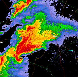 The Raleigh supercell as it is about to enter the town. The upside down triangle icon is a tornado vortex signature marker.