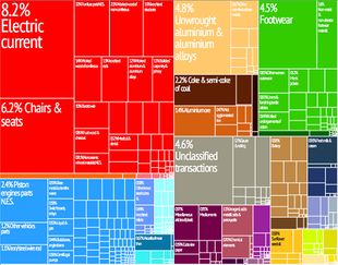 الصناعات الرئيسية | الصلب، الفحم، خام الحديد، القصدير، الزنك، المنجنيز، البوكسايت، المركبات، النسيج، منتجات التبغ، الأثاث، الدبابات، الطائرات، الأجهزة المنزلية، تكرير النفط |