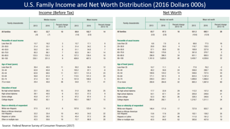 احتلت الولايات المتحدة المرتبة 41 في تفاوت الدخل من بين 156 دولة عام 2017،[74] وهو الأعلى مقارنة ببقية بلدان العالم الغربي.[75] استمر كل من هذه المتغيرات في منطقة ما بعد الركود بعد تلك التواريخ، حيث أصبح الانتعاش الأمريكي ثاني أطول فترة مسجلة بحلول أبريل 2018.[76]