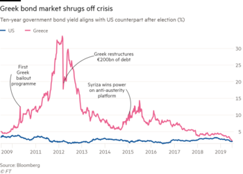 - ^ Robin Wigglesworth (2019-07-10). "Greek bond yields dip even lower than US Treasuries". فاينانشل تايمز.