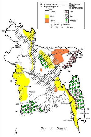 - الأرز: وهو المحصول الرئيسي في البلاد، لكونه مادة الغذاء الأساسية لملايين السكان. ويحتل الأرز نسبة 85٪ من الأراضي الزراعية. ويزرع على مدار السنة على ثلاثة مواسم: أرز صيفي ـ ويدعى باسم أرز أوس Aus ـ ويجنى في تموز أو آب، وأرز خريفي ـ ويدعى باسم أرز أمون Amon ـ وهو أرز مغمور بالمياه يجنى في تشرين الأول والثاني، وأرز شتوي ـ ويدعى باسم أرز بورو Boro ـ ويزرع في كانون الأول ويجنى في نيسان. ويصدر جزء من محصولي أرز أوس وأمون، مع أن إنتاج بنگلادش من الأرز الذي يبلغ سنوياً نحو 25 مليون طن لايكفيها، مما يجعلها تستورد أرزاً رخيصاً بدلاً من الأرز الذي يصدر، وتنتشر زراعة الأرز في عموم البلاد، مع تركزها في جنوبي وشمالي غربيها محصولاً وحيداً.