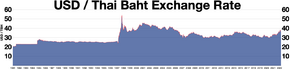 The Thai economy collapsed as a result of the 1997 Asian financial crisis. Within a few months, the value of the baht floated from THB25/US$ (its lowest point) to THB56/US$. The Stock Exchange of Thailand (SET) dropped from a peak of 1,753.73 in 1994 to a low of 207.31 in 1998.[51] The country's GDP dropped from THB3.115 trillion at the end of 1996 to THB2.749 trillion at the end of 1998. In dollar terms, it took Thailand as long as 10 years to regain its 1996 GDP. The unemployment rate went up nearly threefold: from 1.5 percent of the labor force in 1996 to 4.4 percent in 1998.[52]