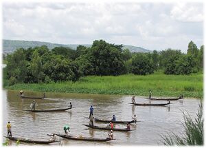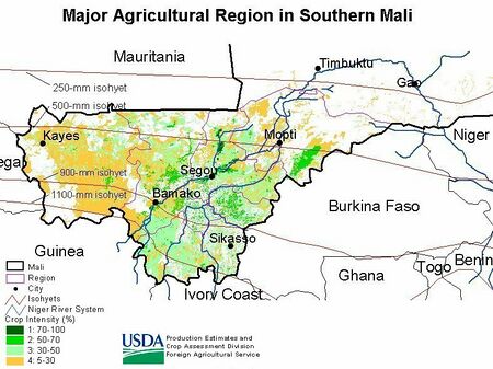 The major agricultural region in southern Mali, showing isohyet lines and crop intensity percentages. Mali's most productive agricultural region is located between Bamako and Mopti. Irrigation water is used mainly for rice while cotton is grown as a rainfed crop. (USDA: 2001)