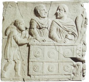صراف روماني على "بنك" (طاولة) لعد النقود