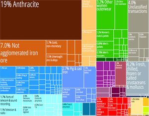 المعادن، المنتجات المعدنية، الصناعات (بما في ذلك الأسلحة)، المنسوجات، المنتجات الزراعية والسمكية، الفحم، خام الحديد، الحجر الجيري، الجرافيت، النحاس، الزنك، والرصاص.