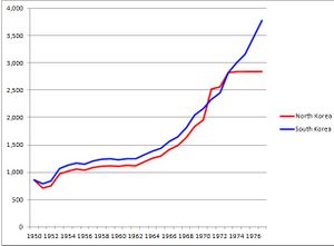 The comparison of the GDP trends on two Koreas from 1950 to 1977 (in 1990 Geary-Khamis dollars)