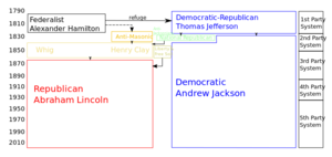 وكان ألكسندر هاملتون وجيمس ماديسون قد حذرا، في "الأوراق الفدرالية" سنة 1788، من أخطار الأحزاب السياسية المحلية. كما أن جورج واشنطن، أول رئيس للبلاد، لم ينضم أبداً إلي أي حزب سياسي، وأعرب عن أمله بأن لا يتم تشكيل أحزاب سياسية. [3]