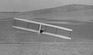 First flight of the Wright Flyer I, December 17, 1903, Orville piloting, Wilbur running at wingtip.