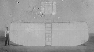 Orville at Kitty Hawk with the 1901 glider, its nose pointed skyward; it had no tail.