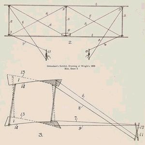 Wright 1899 kite: front and side views, with control sticks. Wing-warping is shown in lower view. (Wright Brothers drawing in Library of Congress)