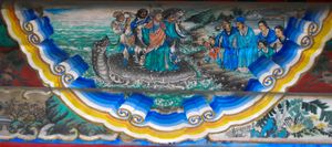 الخالدون الثمانية have an existence in mythology as well as developed a presence in religious Daoism, and art and literature. The standard group is He Xian'gu, Cao Guojiu, Li Tieguai, Lan Caihe, Lü Dongbin, Han Xiangzi, Zhang Guolao, and Han Zhongli (also known as Zhongli Quan). Collectively or individual the eight immortals walk, ride, fly, or congregate in many myths.