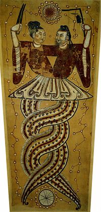 Nuwa and Fuxi (also known as Paoxi) are sometimes worshiped as the ultimate ancestor of all humankind and are often represented as half-snake, half-humans. Her companion, Fuxi, also called Fu Hsi and Paoxi was her brother and husband.