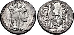 The coins of Tigran II's predecessors bore the Greek title Basileos megalou (great king).[20] Tigran II, however, used the term Basileus basileon (king of kings) on coins minted in Artaxata, Nisibis, and Tigranocerta, even after his re-installment by Pompey as a client-king of Rome.[22]