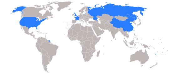 يوضح الجدول التالي الأعضاء الدائمون الحاليون في مجلس الأمن الدولي: