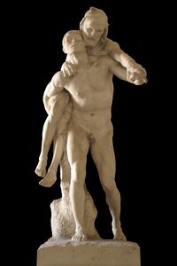In the 1883 Salon there were no less than three statues of L'aveugle et le paralytique on show. The most celebrated was by Jean Turcan, whose plaster model of the subject received a first class medal. Subsequently, the French state arranged for him to carve it in marble and this version was exhibited at the 1888 Salon, when it received a medal of honour. The next year it was given a further prize at the Universal Exhibition and afterwards was placed in the Musée du Luxembourg. In 1927 it was moved to Arles, Turcan's birthplace, where it has remained.[30] A bronze version was also created for Marseilles, the city that had provided him with a bursary to study sculpture, but this was to be melted down during World War II. When the marble statue was photographed by the state in 1888, it is to be noted that the fable was attributed to Aesop, not Florian.[31]