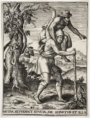 New life was given to the theme in the Renaissance when Andrea Alciato adapted the epigram by Leonidas into Latin and used it in his Book of Emblems (1534) to symbolise the theme of mutual support (mutuum auxilium).[6] Other illustrated emblem books were to give the theme new interpretations. Jan Sadeler's Emblemata evangelica ad XII signa coelestia (Antwerp, 1585) pictures the pair crossing a plank bridge in the lower foreground of a majestic landscape, with Latin epigraphs exhorting charity.[7] In the Emblemata saecularia (Oppenheim, 1596) of Johann Theodor de Bry, the illustration is dependent on Alciato's, particularly in the detail of the deformed leg; it also references the trope of the Elm and the Vine, another of Alciato's emblems. Combining the meaning of both, the print carries the epigraph Mutua si fuerint studia, hic servatur et illa, "Each is served where the objectives are common" (plate 46).[8] The theme of mutual support was also carried forward into an 18th-century Low Countries print titled "The Allegory of Poverty", where the blind man carrying a cripple appears once again in a rural setting, with the addition of a huntsman defending a sleeping man from a feral dog.[9]