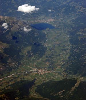 The Prokletije mountains, the southernmost part of the Dinaric Alps, stretch more than 40 miles from Skadar Lake along the Montenegrin–Albanian border in the southwest to Kosovo in the northeast. These points are at 42°45' and 42°15' N in the Mediterranean zone of the western شبه جزيرة البلقان.[2][3] The southern boundary of the Prokletije is found at the river Drin and its tributary Valbona. In a broader sense the Prokletije also include the mountain ranges to Kosovska Mitrovica with the Hajla and Mokna massifs. Some authors, however, see the river Lim as the northern boundary of the Prokletije in geological terms.