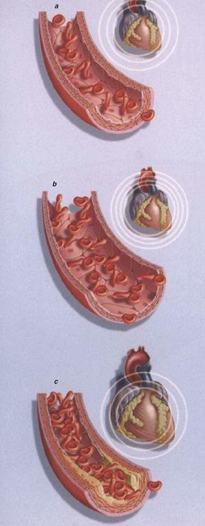 لقد شرحنا دور عوامل النمو والأنسولين في تكاثر الأوعية الصغيرة ومخاطر تصلب الشرايين الناتج من فرط الدهون المرافق. ولنتكلم الآن عن الأذيات في جدر الأوعية وخاصة تلك الناتجة من زيادة السكر. إننا نلاحظ تغيرا في قدرة تلك الأوعية على إنتاج عوامل الإرخاء العضلي: أحادي أكسيد النتروجين، والپروستاسيكلين prostacycline الذي تنتجه خلايا البطانة الشريانية، والذي يعتبر مثبطا قويا يمنع تجمع اللويحات. هذان العاملان يسمحان بارتخاء جدر الشرايين، ومن ثم زيادة قطر الشرايين في الأعضاء عندما تكون بحاجة إلى زيادة في التدفق الدموي. هذه الجزيئات المرُخِيَّة (المسببة للارتخاء) هي من العوامل الفيزيومرضية physiopathologic الأساسية في اعتلالات الأوعية الكبيرة والصغيرة عند المرضى السكريين، وعندما يعمل الشريان بشكل صحيح يكون باستطاعته أن يغير قطره لزيادة أو إنقاص التدفق الدموي للأعضاء بحسب حاجتها، لكن عند المصابين بالداء السكري فإن خلايا الأوعية لا تستطيع أن تنتج العوامل المُرْخِية، ومن ثم لا تستطيع الشرايين أن تغير أقطارها، ويجب على القلب أن يقوم بعمل إضافي لتغذية الأعضاء بالدم. وفي معظم الأحيان يتضخم القلب عند المرضى السكريين لكي يؤمن هذا العمل الإضافي (انظر الشكل 2). إن الخلل الوظيفي الذي يصيب الخلايا البطانية يؤدي إلى زيادة في إنتاج الجذور الحرة السامة للخلايا. وفي الواقع إن زيادة تركيز الگلوكوز في الوسط خارج الخلايا وداخلها تخل بالتوازن ما بين الجزيئات المؤكسِدة ومضادات التأكسد. إن الجزيئات الكبيرة مثل الپروتينات الدهنية والدنا DNA، وخاصة في خلايا جدر الأوعية تتأذى بسبب الجذور الحرة.