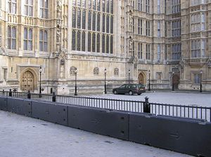 Security measures taken to protect the Houses of Parliament in Westminster, إنگلترة. These heavy blocks of concrete are designed to prevent a car bomb being rammed into the building.