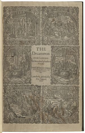 A copy of Boccaccio's The decameron containing an hundred pleasant nouels. Wittily discoursed, betweene seauen honourable ladies, and three noble gentlemen, printed by Isaac Jaggard in 1620.
