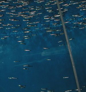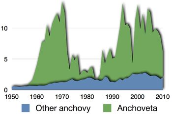 The anchovy is a significant food source for almost every predatory fish in its environment, including the California halibut, rock fish, yellowtail, shark, chinook, and coho salmon. It is also extremely important to marine mammals and birds; for example, breeding success of California brown pelicans[4] and elegant terns is strongly connected to anchovy abundance.