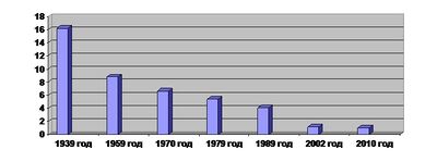 The population of JAO has declined by almost 20% since 1989, with the numbers recorded being 215,937 (تعداد 1989)[46] and 176,558 (تعداد 2010);[9] The 2010 Census reported the largest group to be the 160,185 ethnic Russians (93%), followed by 4,871 ethnic Ukrainians (3%), and 1,628 ethnic Jews (1%).[9] Additionally, 3,832 people were registered from administrative databases, and could not declare an ethnicity. It is estimated that the proportion of ethnicities in this group is the same as that of the declared group.[47]