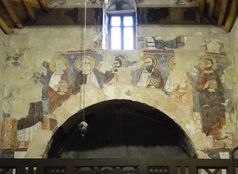 وَ كَانَتَ لَوْحَةُ الدَّيْنُوْنَةِ عَلَى الجدَارِ الغَرْبيِّ مِنْ أَهَمِّ الرُّسُوْمَاتِ التِي تُمَثِّلُ المَسِيْحَ وَالتَّلَامِيْذَ، وَكَذَلِكَ العَذْرَاءُ مَعَ آبَاءِ الكَنِيْسَةِ، وَالإِنْجيْلِيِّيْنَ الأَرْبَعَةَ،[111] وَاخْتَلَفَ أُسْلُوْبُ رَسْمِ الطَّبَقَةِ الأُوْلَى عَنْ مَا هُوَ عَلَيْهِ فِي الطَّبَقَتَيْنِ الثَّانِيَةِ وَالثَّالِثَة اللَّتَيْنِ حَمَلَتَا مَعَالِمَ وَاضِحَةً لِأُسْلُوْبٍ سِرْيَانِيٍّ مَحَلِّيٍ، خَاصَّةً وَأَنَّ الكِتَابَاتِ عَلَى الصُّوَرِ كَانَتْ بالسِّرْيَانِيَّةِ وَالعَرَبيَّة، إِلَى جَانِبِ رُمُوْزِ بَعْضِ القِدِّيْسِيْنَ باليُوْنَانِيَّةِ البيْزَنْطِيَّة.[112]