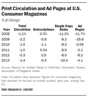 بين عامي 2000 و 2015 ، انخفضت عائدات إعلانات الصحف المطبوعة من 60 مليار دولار إلى ما يقرب من 20 مليار دولار.[47] حتى يوم واحد من الأيام الأكثر شيوعًا للأوراق ، الأحد ، شهد انخفاضًا بنسبة 9 ٪ في التوزيع وهو أدنى مستوى منذ عام 1945.[48]
